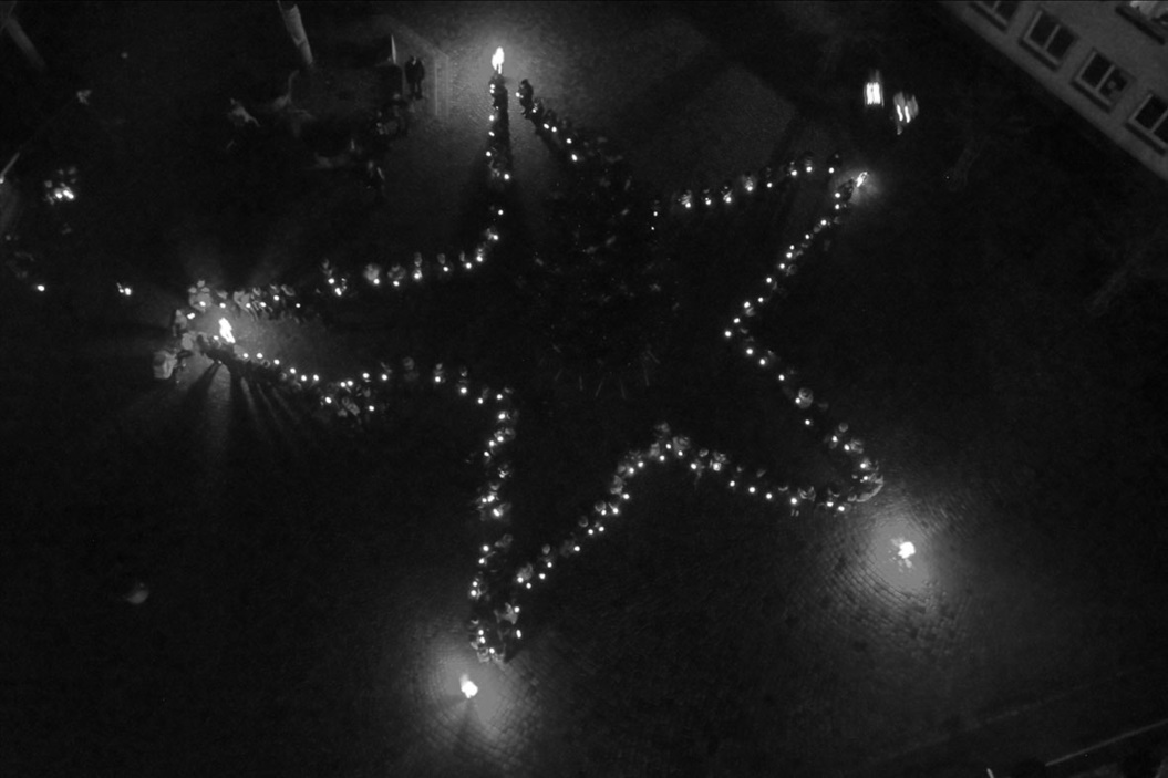 - Am 22.11.19 fand auf dem Rathausplatz die Auftaktveranstaltung statt. Wir waren in luftiger Höhe dabei und haben die Entstehung des Menschensterns gefilmt. Das Video dazu steht auf YouTube.
